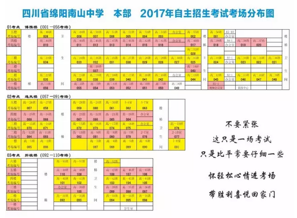 代表琢玉楼,“06”代表绵阳外国语实验学校,“07”代表南山中学实验学校博雅楼。第四五六位数码代表考场序号,第七八九位数码代表座位号。:“101001001”的含义是:考生的考点为南山中学本部,考场楼栋为南山中学本部博雅楼楼,考场号为第一考场,座位号为第一个座位。又如:“202002003”的含义为:考生的考点为南山中学实验学校,考场楼栋为南山实验学校弘毅楼,考场号为第二考场,座位号为第三位。